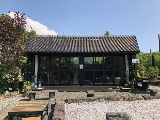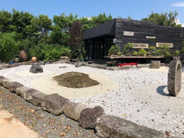黒いファームガレージの前には枯山水があり、建物横には盆栽が並んでるという和風な場所。